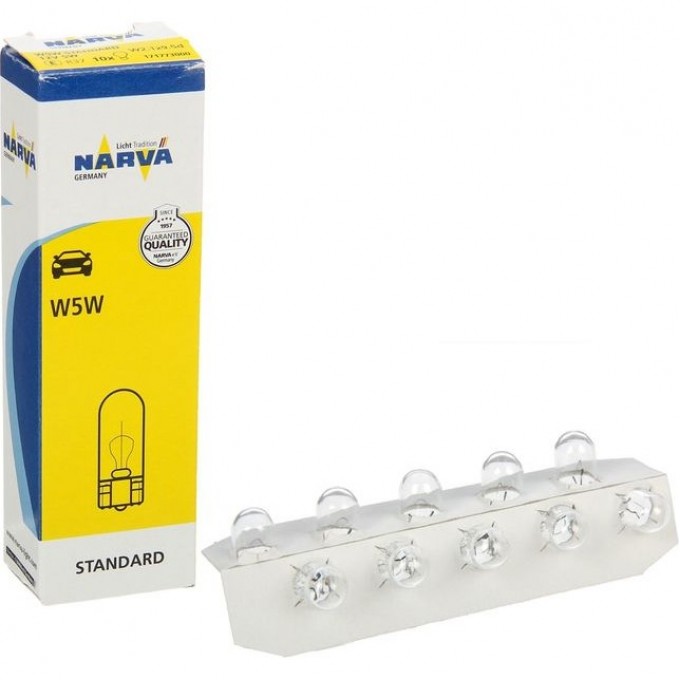 Автомобильные лампы накаливания от немецкого производителя Narva представляют собой бесцокольные источники света, упакованные в картонную фирменную коробку по 10 штук, которые предназначены для освещения приборной панели легкового автомобиля. Они также подходят для освещения других зон внутри ТС и рассчитаны на бортовое напряжение 12 Вольт. Лампы относятся к категории W2.2W и оснащены цоколем W2.1x9.5d, который внешне представляет собой две проволоки, выведенные с нижней сплюснутой части колбы и загнутые по разным сторонам. Поэтому такой тип источников света фактически считается бесцокольным. Мощность каждой модели составляет 2.2 Ватта. Маломощные изделия имеют небольшой расход электроэнергии, поэтому служат дольше и требуют редкой замены. Они обладают компактными размерами и отличаются легкой установкой.